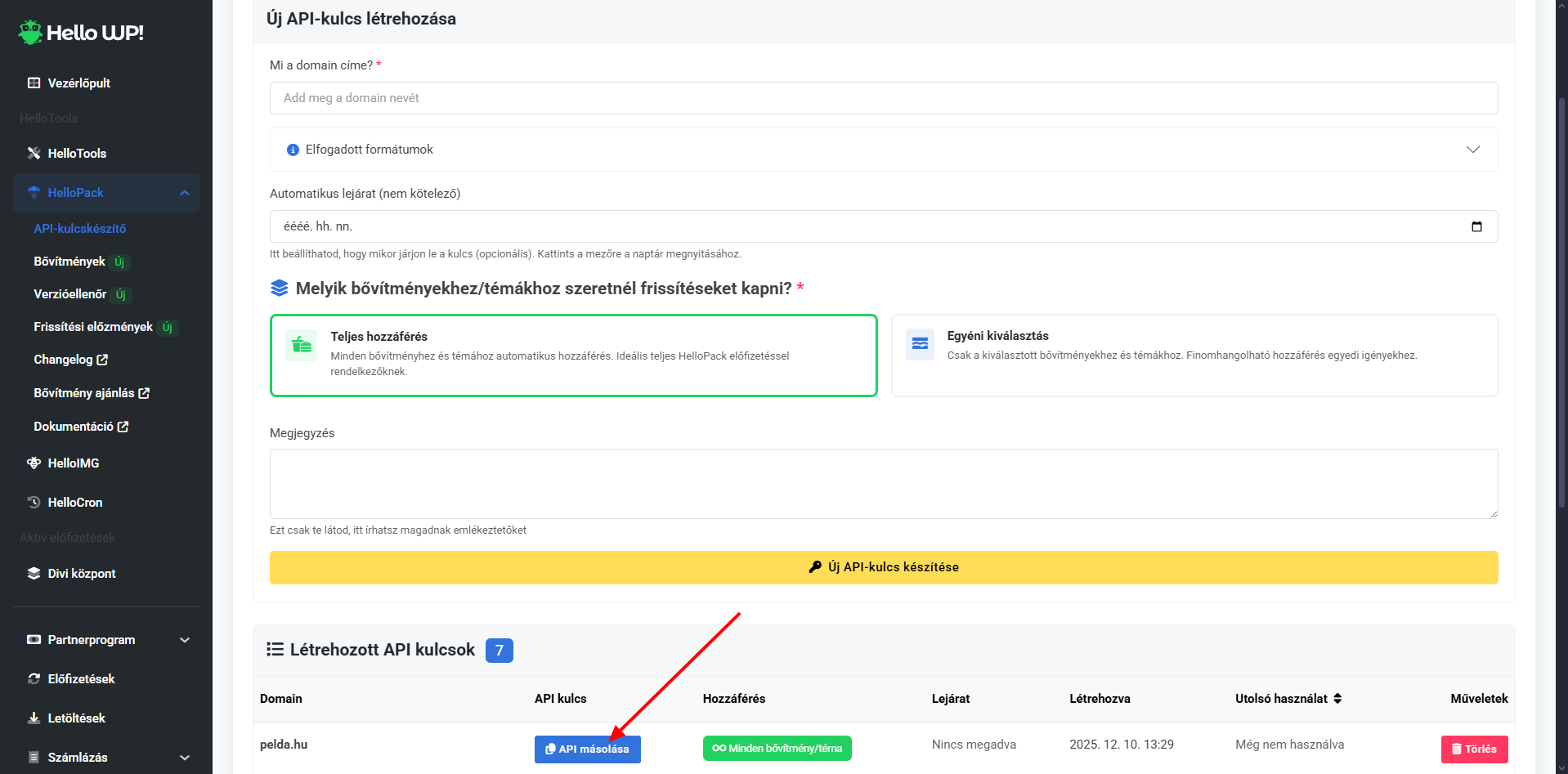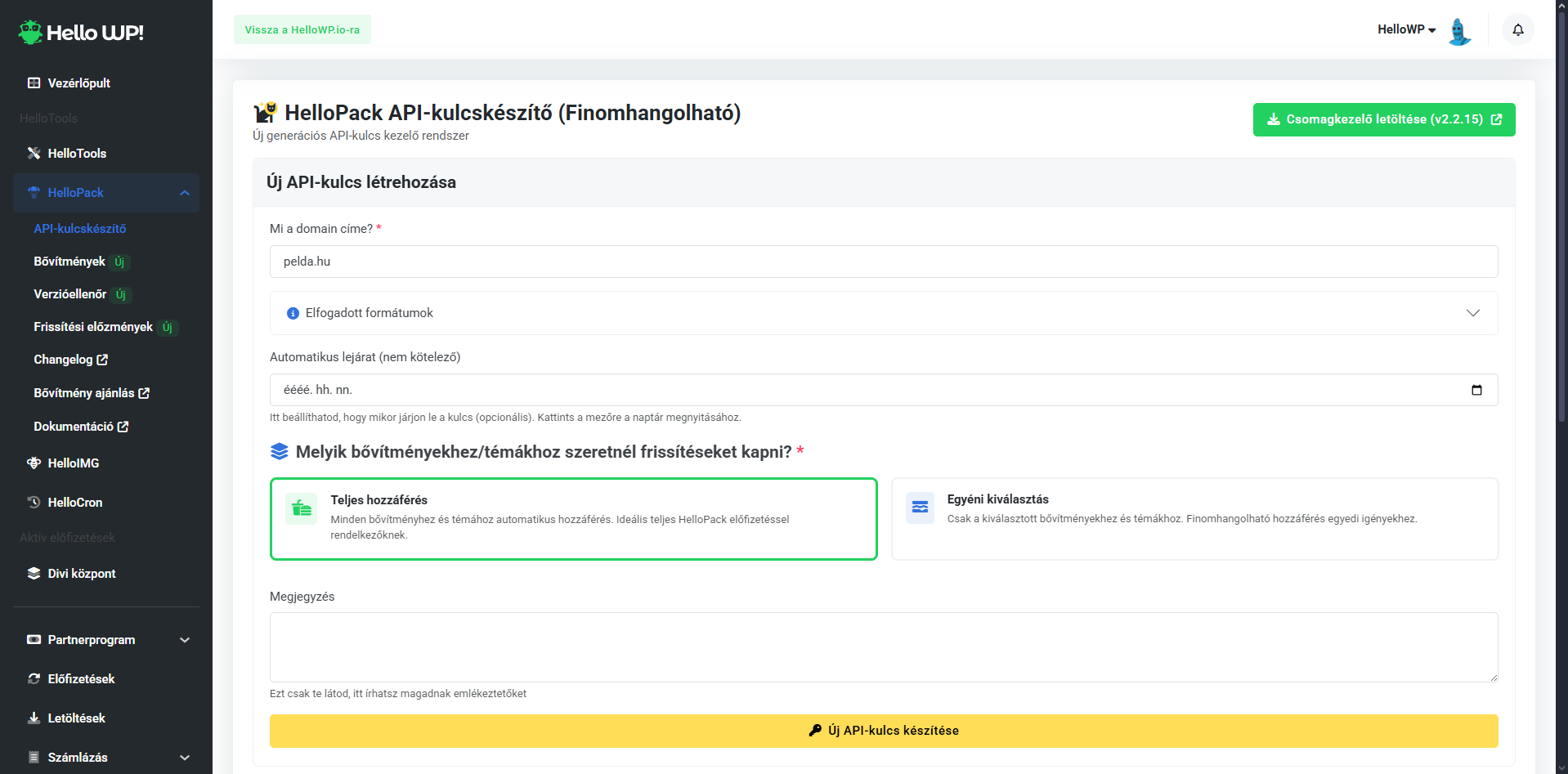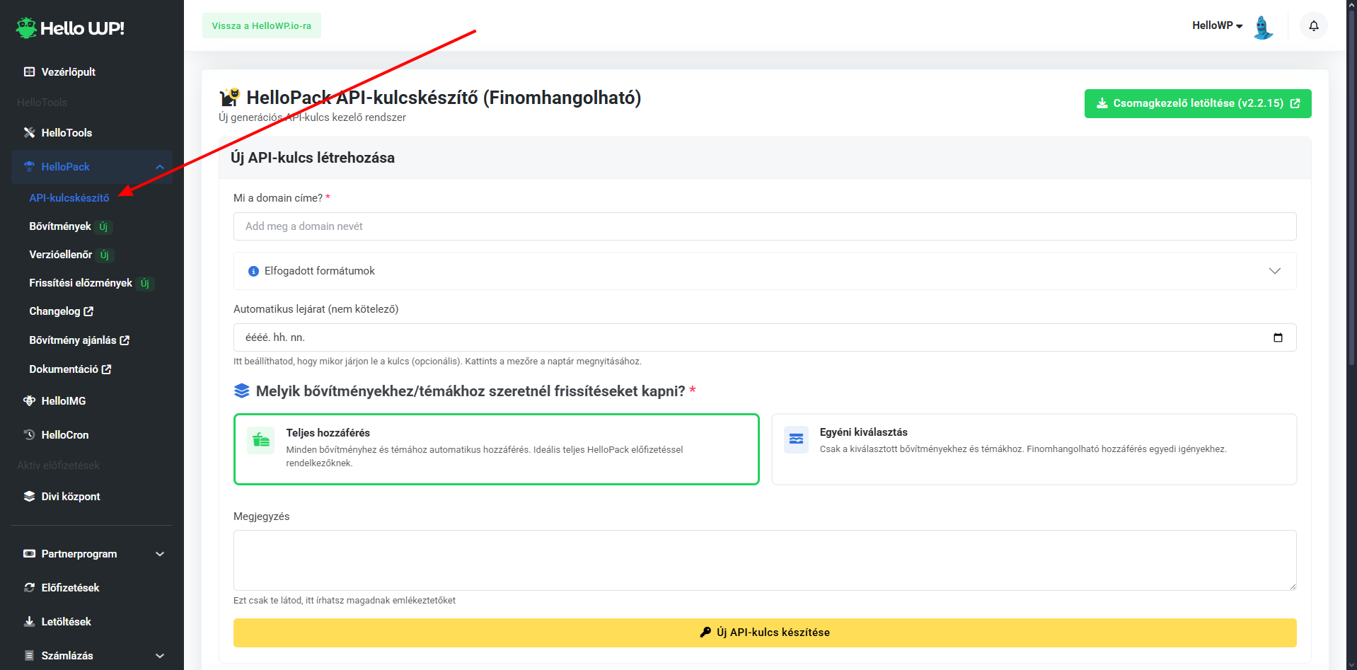 - Belépés: Lépj be a HelloConsole-ba (https://hellowp.io/hu/helloconsole/), és navigálj a HelloPack → API-kulcskészítő menüpontra.