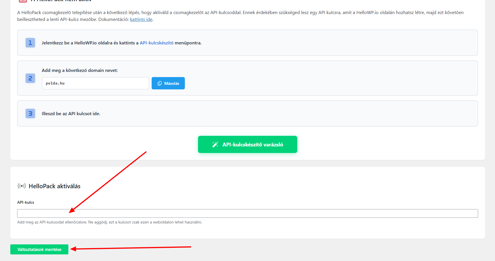 - HelloPack aktiválása: Most már csak aktiválnod kell a HelloPack-ot a létrehozott kulcsoddal.