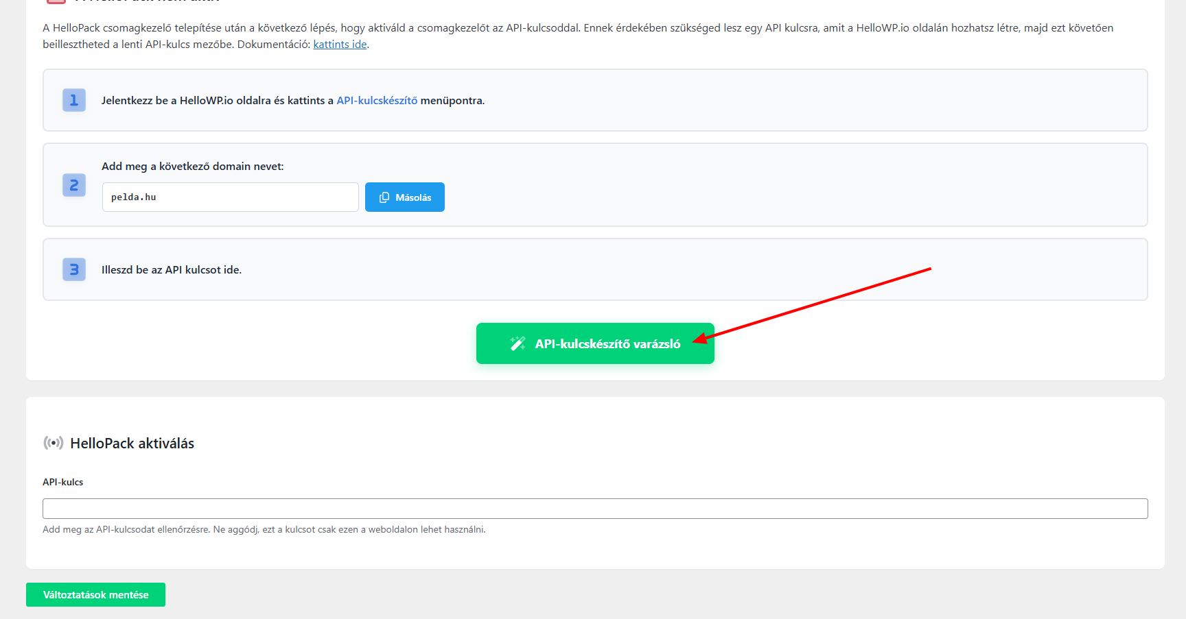 - Varázsló indítása: Lépj be a WordPress vezérlőpultodba, nyisd meg a HelloPack menüpontot, majd görgess lejjebb és kattints az „API-kulcskészítő varázsló" gombra.