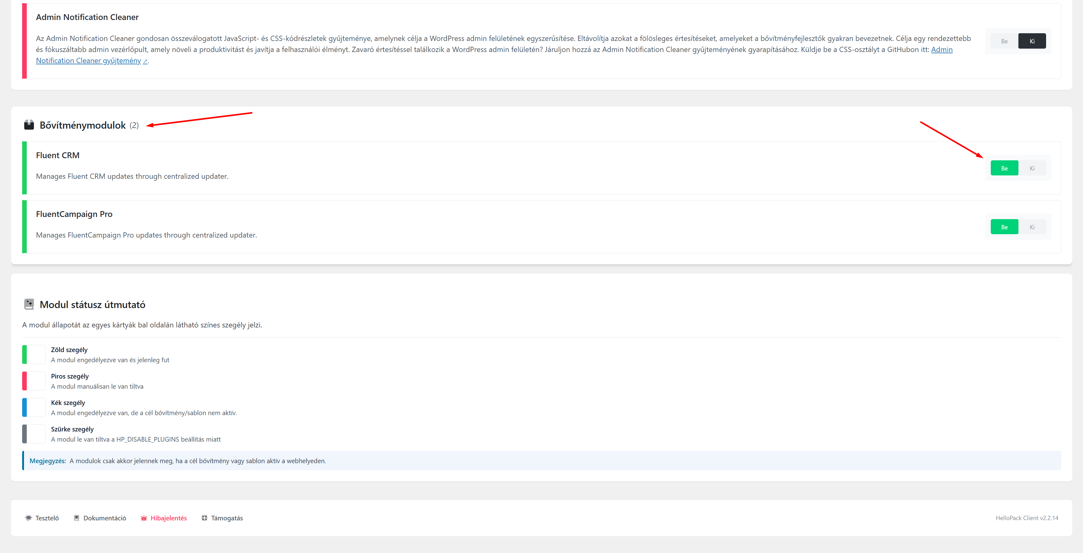 A Hellopack csomagkezelőn keresztül lehetőséged van az egyes bővítmények esetében kikapcsolni a Hellopack license kezelését. Ehhez navigálj a WordPress admin -> Hellopack -> Modulok menüpontba.